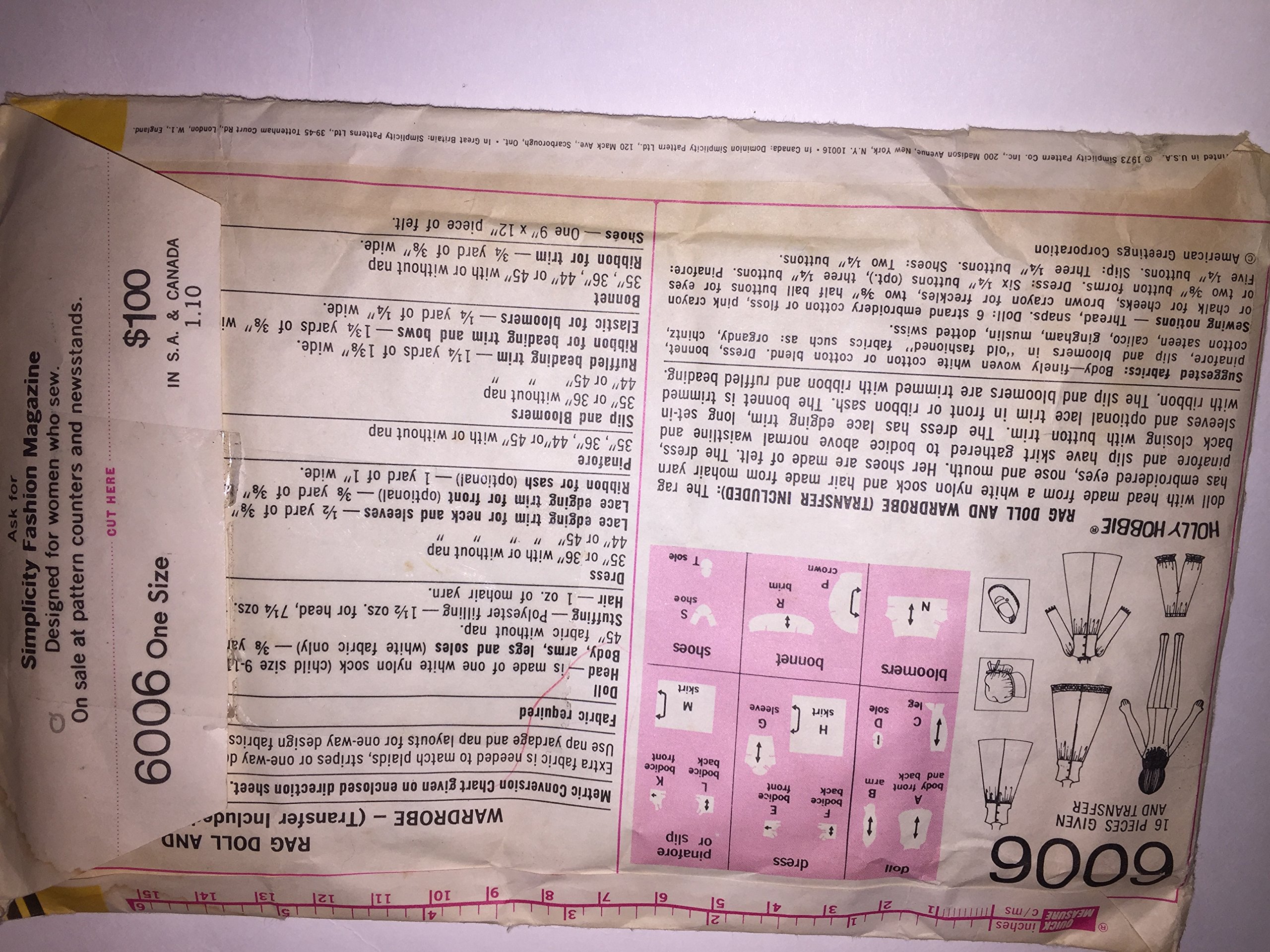 Simplicity Pattern 6006 Holly Hobbie Stuffed Rag Doll Pinafore Bonnet Bloomers Shoes Vintage Used Sewing Pattern Heaven